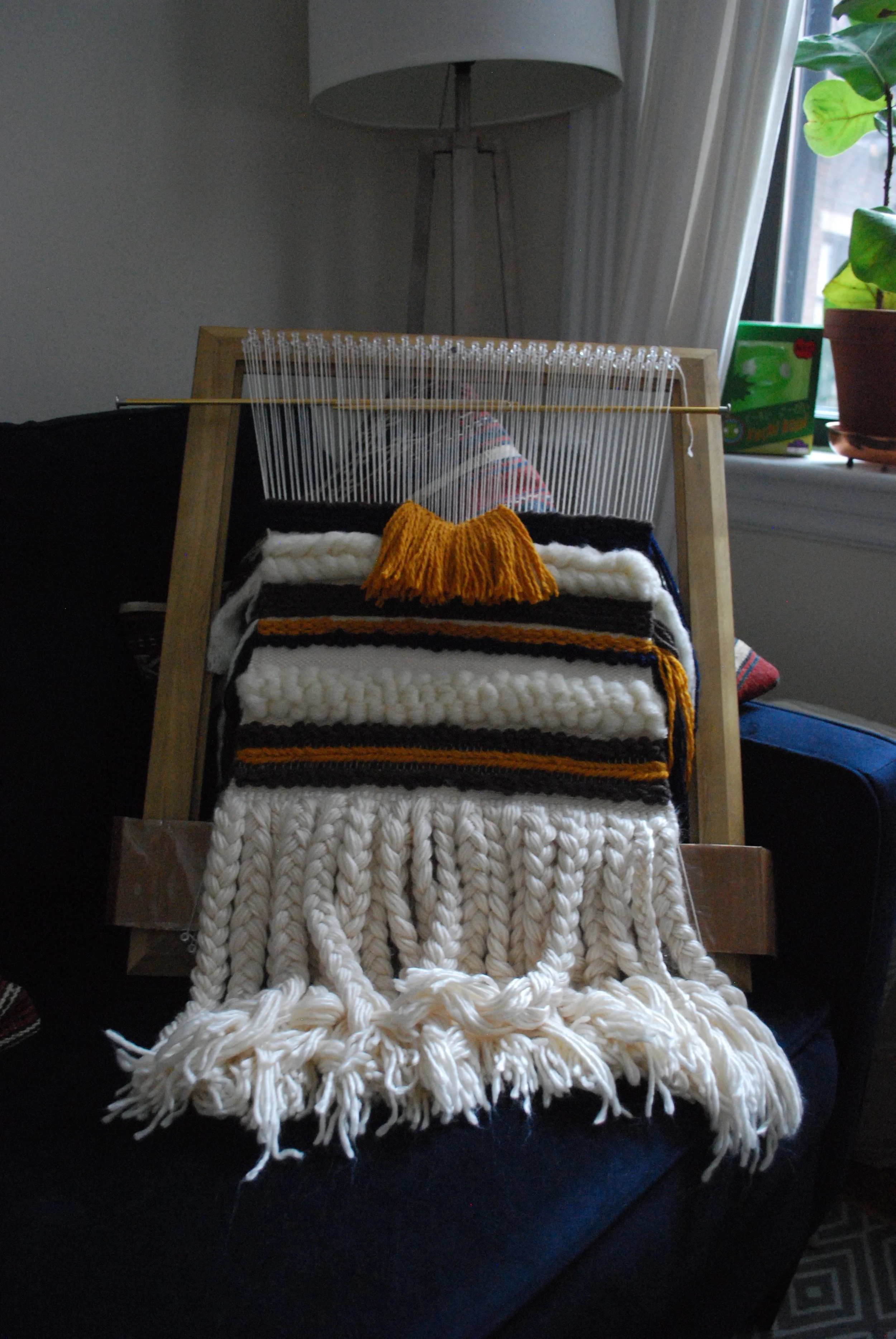 I made a loom using a 16x20 picture frame and about 130 pushpins. The tapestry took 40+ hours to make. I started this project as a way of using old yarn in my stash. Weaving is quite the learning curve. This project was exhilarating, nerve-racking, and incredibly rewarding.